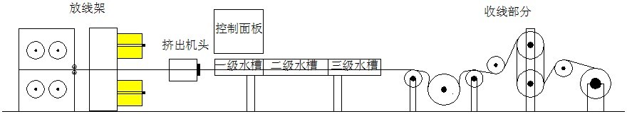 对于六芯扁平带状软光缆而言,Ф50护套机能完全满足它的生产要求,生产线的结构简图如下所示: