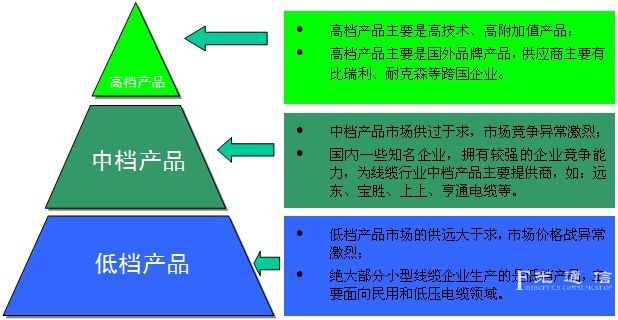 我国线缆行业产品水平居世界中下游,但科技含量在不断提高。目前,我国线缆市场上有国标、厂标、非标三种标准的产品。依据产品科技含量、附加值高低等因素可将现有线缆行业产品分为高、中、低档三个档次。以我国现在的电缆市场行情、行业需求的发展趋势来看,当务之急是提高电缆的科技含量,提高技术水平,实现产品结构的高端化。详细情况如图1所示。