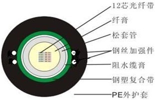 GYDXTW光缆是将光纤带套入由高模量的塑料做成的松套管中,套管内填充光纤填充油膏。松套管外用双面涂塑(皱纹)钢带纵包,钢带和松套管中间的阻水缆膏保证了光缆的纵向阻水,钢带两侧放置平行钢丝加强后护套成缆。