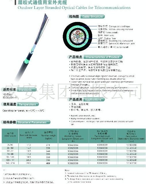 结构:金属加强构件、松套层绞填充式、铝-聚乙烯粘结护套、纵包皱纹钢带铠装、聚乙烯护套