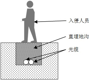 将两条光缆同埋在深0.15m的沟中,然后覆土、压实,由一位试验人员在沟上行走模拟入侵。图11是试验原理示意图,图12是环境背景波形图,图13-1和图13-2分别是常规结构传感光缆和2S+2T传感光缆的事件脉冲波形图。