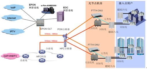 在HFC网络的分前端部署OLT设备,在光站处部署ONU设备,中间利用HFC网络空闲的光纤资源实现EPON ODN网络的搭建。从光站到用户之间仅有同轴电缆资源,可采用EOC(Ethernet Over Coax)技术实现数据业务在同轴电缆上的传输。因此采用EPON+EOC的建设模式,广电运营商可以不用改动既有HFC网络的线路设备即可实现网络的双向化改造,实现快速、低成本的网络升级。EPON+EOC改造后,广电网络具备了双向数据传输能力,可以开展互动电视、宽带上网、电话等交互业务的运营。