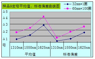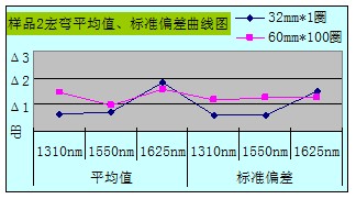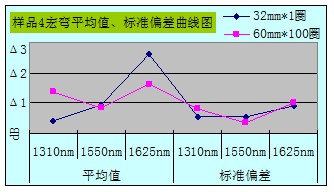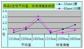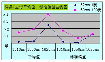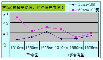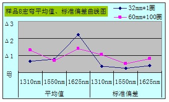 从整体数据汇总图可看出Φ32mm*1宏弯测试方法所得数据的平均值和标准偏差都比Φ60mm*100的要小,且数据相对稳定,重复性好。当然所抽样品也不是完全都遵循此规律,10个样品中有3个样品在1625nm窗口下Φ32mm*1所得数据的平均值大于Φ60mm*100所测得的;还有1个样品在1550nm、1625nm窗口下所得数据的标准偏差大于Φ60mm*100的。