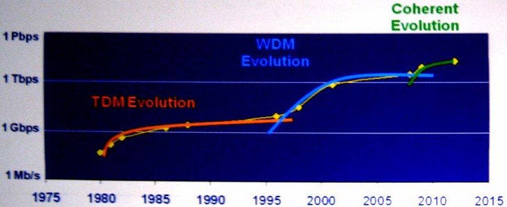 WDM波分复用广泛的应用恰逢2001 年后IT泡沫危机时期.它反之使光纤市场需求缩减,使光纤产业进入了长达10年萧条期,至今才涅槃复苏。相干光通信即将商用,对光通信产业的拉动极大,其中蕴藏着巨大的商机。