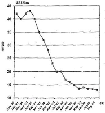 21世纪初光纤光缆的价格曾经跌到最低谷(参见图4 ),在10年以前一些厂家纷纷倒闭、合并、转向. 近年来,随着光纤市场需求猛增,为满足市场需求,光纤制造商(包括康宁公司和Draka公司)通过增加生产设备、改进生产工艺等措施,大大提高了光纤生产能力,特别是在2008年上半年生产能力快速增长。2008年上半年美国国内需求的光纤是1630万纤芯公里,比2007年同期增加11%。美国在2008年上半年净出口光纤总计达800万纤芯公里,比2007年同期的510万纤芯公里增加了56%。除了美国之外,其他几个主要光纤生产国,光纤产量在2008年第二季度达到历史最高水平:印度140万纤芯公里,意大利150万纤芯公里以及日本830万纤芯公里。中国在2007年第四季度生产了1050万纤芯公里,2008年上半年生产了2010万纤芯公里。另外一些光纤生产国,在2008年上半年的产量也接近1999年至2001年光纤光缆繁荣期的历史最高记录。