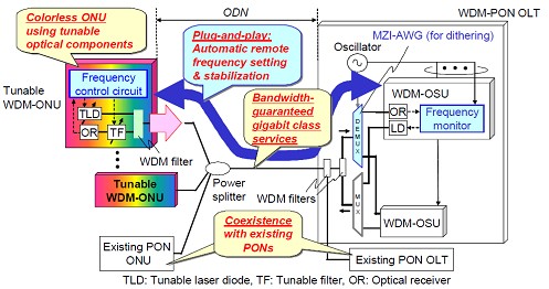 此WDM-PON有四个特点。首先,WDM-PON可以利用基于现有的功率分路器的基础设施而不须改变,可以通过使用未使用的波长频段,例如,未来的L波段与已经安装在现场的PONs并存。第二个特点是,在密集波分复用(DWDM)技术的基础上,能够对每个用户提供各种千兆位级带宽保证的服务。第三个特点是一种无色的ONU,结合DWDM技术和可调光学元件能够简化频率管理和降低库存成本。第四个特点是即插即用功能,这意味着远程自动频率控制。