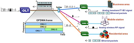对上行通信来说,每个ONU将数据和/或信号分配给指定的子载波,清空所有剩余的子载波,并完成OFDM调制产生一个完整的帧结构。对于下行通信,根据频域和时域安排的结果,OLT保留某些专用子载波、透明通道和基于压缩分组的数据进入剩余的OFDM频带和时间段,。OFDM帧和其他模拟信号通过电耦合器进行混合后驱动光调制器。当混合信号到达ONU时,每个ONU从适当的子载波、通道和时段选择自己的数据或信号。OFDMA-PON通过这种方法提供必要的灵活性和可扩展性,以解决新出现的任何未来应用。
