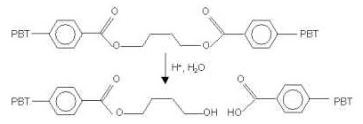 PBT材料还有另外一个关键性能是抗水解。因为PBT是由对苯二甲酸和丁二醇单体在高温和真空下酯化、脱水缩聚而成,而它在水的作用下其水解反应是可逆的,也就是说它在湿热的环境下可以使缩聚后的PBT材料分解,分子链断裂,从而使其分子量下降,当下降到一定程度后,水解后的PBT树脂会出现脆化、韧性下降、易于开裂,最后会丧失机械性能,起不到应有的作用。其水解反应如下式所示: