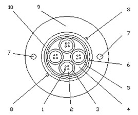 6- 阻水带;7-抗张元件(钢丝、FRP、KRP等);8-撕裂绳;9-PE护套;10-皱纹钢带。
