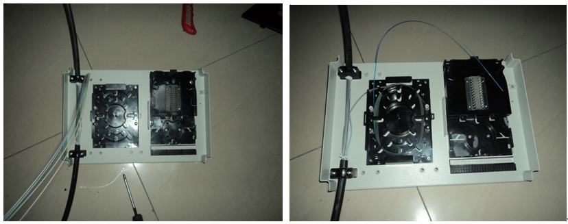 ④取出所需光纤带,按光缆接续常规操作把光缆进行固定,直行光纤带盘留于接续盒内(避免打圈问题)准备熔接接续,如图5、6所示;