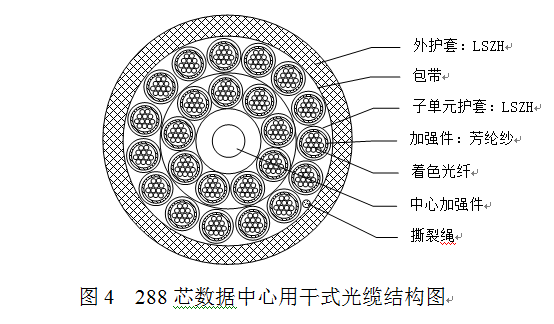 图4为烽火通信开发的一种数据中心用干式光缆,该光缆以2-12芯的干式套管为基本单元,套管材料为低烟无卤阻燃聚烯烃材料,整体光缆包含4-24根子单元,光缆芯数可做到244芯,光纤类型采用OM3、OM4高带宽光纤。该类型光缆分支便利、结构紧凑、光纤密集度高,每个子单元可加工2-12芯的MPO终端连接器,在数据中心内使用,可大大扩宽数据传输量,光缆机械性能良好,有限保证光缆的使用寿命及稳定性。(见图4、表3)