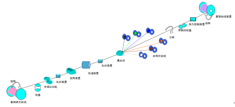 骨架缆生产工序主要由骨架槽放线装置、光纤带放线装置、入槽装置、扎纱装置、充油装置、包带绕包装置和收线装置等组成,具体的工艺流程图见图4: