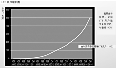 全球移动供应商联盟(GSA)发布的最新数据显示,截至2014年年底,全球LTE用户数为4.97亿户,接近5亿大关,去年全年新增LTE连接数为2.9亿,其中去年第四季度新增LTE连接数为1.15亿。